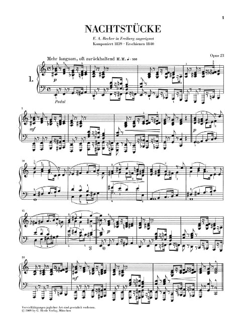 Gloomy premonitions plagued Schumann whilst he was working on his latest composition in 1839. The news that his brother Eduard was dying had deeply shaken him. Writing a 'Corpse Fantasy' since Monday, he wrote in his diary on 31 March. While he was preparing the composition for publication three-quarters of a year later, he chose the title Night Pieces with reference to E.T.A. Hoffmann. However, Schumann probably did not want the work to be perceived as being so nocturnal and dark, because he associated with it the desire that it should pleasantly remind one of his brothers, who had in the meantime died. We are now publishing it in a newly revised version by Ernst Herttrich reflecting the latest in scholarly research.