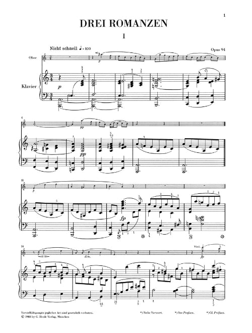 Robert Schumann in fact composed just one work for the clarinet, namely the Drei Fantasiestücke op. 73 for clarinet and piano of February 1849. But the Drei Romanzen op. 94 for oboe, written at the end of that same year, we marketed with solo parts for clarinet and for violin too. Clarinettists are certainly delighted that G. Henle Verlag is following this principle of alternative scoring. The manuscript that Robert gave to his wife Clara in 1849 as a Christmas gift does not survive. Instead, autograph sketches have been consulted for our Urtext edition, and these have enabled correction of some irregularities in the 1851 first edition. The editor's preface and commentary give extensive information on textual questions.