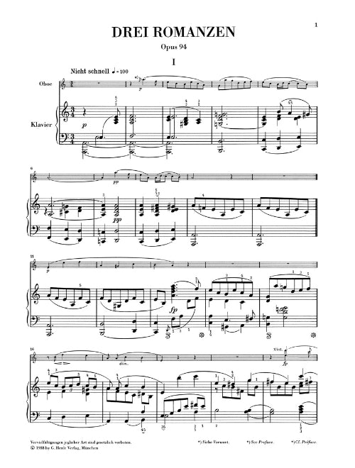 In 1849, Schumann gifted chamber music works to three wind instruments: the clarinet with the Drei Fantasiestücke op. 73, the horn with the Adagio and Allegro op. 70, and the oboe with these Drei Romanzen op. 94. In te first Romance, we have a ballade-like mood in A minor. The second romance resembles a song without words, and is in A major, while the finale, with its calling motifs and piano arpeggios, recalls the popular poems of Northern Europe of the time. Composed in December 1849, the Romanzen were presented to Schumann's wife Clara as a Christmas present. This manuscript does not survive, but it has been possible to consult some autograph sketches for our Urtext. The editor's preface and commentary provide extensive information about the sources and the textual problems encountered.
