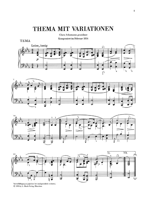 It was in February 1854, a few weeks before Robert Schumann's admission to the psychiatric hospital in Endenich, that he wrote his variations on a theme in E flat Major. Because of the extraordinary, personal and moving events of those days, Clara Schumann guarded the manuscript pages of her husband's final piano composition, dedicated to her and later called Ghost Variations, like relics, and prohibited their publication. THe first edition was not published until 1939, and in many respects does not correspond with what Schumann actually wrote down. For the first time, the Henle Urtext edition draws upon all the available primary sources, and thus effectively the only reliable Urtext edition of a work that in recent years has been heard with increasing frequency.
