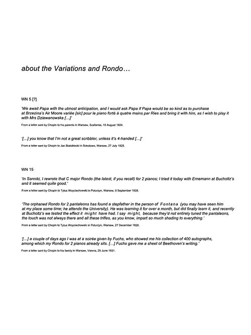 Rondo in C Major, Variations in D Major for Two Pianos, Four Hands Chopin National Edition The Rondo in C Major for two pianos was composed in 1828. The Variations in D Major on an Irish National Air from Thomas Moore was composed in 1826. The National Edition of the Works of Fryderyk Chopin Published by PWM Exclusively Distributed by Hal Leonard Corporation Co-Editors Jan Ekier and Pawel Kaminski The objective of the National Edition is to present Chopin's complete output in its authentic form, based on the entire body of available sources. Sources were analyzed with up-to-date scientific and musicological methodology. The National Edition was based on sources originated from the composer, mainly autographs, copies of autographs and first editions with the composer's corrections, and pupils' copies with Chopin's annotations. In cases when original sources were lacking, the closest possible materials were used. Collecting the source materials was a laborious task which took years of effort. The characteristics of sources, the links and discrepancies between them as well as the reasons for particular editorial decisions are discussed in the Source Commentary in each volume. The Performance Commentary appended to each volume includes: the realization of ornaments, comments on pedal markings (the original markings sometimes are inadequate, due to the difference in sound between pianos used in Chopin`s times and modern pianos), suggestions as to the harmonic legato (a performance technique often used by Chopin and now forgotten). About the National Edition (http://serwer1374796.home.pl/wp-content/uploads/2013/05/o_wydaniu_narodowym.pdftarget=_blank) Full Introduction to the Polish National Edition of the Works of Fryderyk Chopin (http://serwer1374796.home.pl/wp-content/uploads/2013/05/introduction_to_NE.pdftarget=_blank) Inventory # : 00132310 UPC: 884088971441 ISBN: 1480390909 Width: 9.25" Length: 12" Height: 0.317" Product Weight: 1.1 lbs. Number of Pages: 136