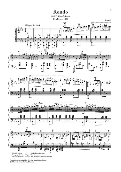 Chopin's early works include a wealth of new stimuli for anyone wishing to take a closer look at the creative works of the Polish genius. Up to now the four Rondos have been missing from our catalogue; but now they are finally available in Henle Urtext. Although they have been unfairly neglected, there are real discoveries to be made. It is hard to imagine that Chopin was only 15 when his Opus 1, the Rondo in cminor, was first published. Likewise, his Rondo op. 5, which incorporates the exotic sounds of Polish folk music, and the brilliant work in C major op. 73were also written during his time in Warsaw. Without a doubt the young composer, who was the darling of the Warsaw salons, wrote these works as showpieces for himself. Here, and also with the Rondo op. 16, his mark is unmistakable. Our Urtext edition is also available as an affordable study score.