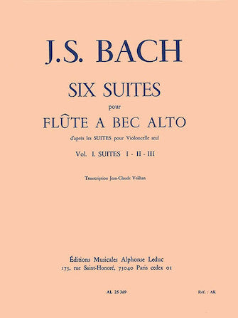 Six Suites - Vol. 1 for Alto Recorder is the first volume of a series of two by J. S. Bach. Initially composed for Cello between 1717 and 1723, it was transcribed by Jean-Claude Veilhan and features the Suites I, II and III. The transcription keeps the original key and only some passages have to be played one octave higher than in the original sheet. The first suite, BWV 1007, is in G major and contains a Prelude, an Allemande, a Courante, a Sarabande, two Minuets and a Guigue. Its Prelude is the most famous movement of the whole set of Suites, consisting mainly of only arpeggiated chords. It can be heard in many films and is highly recognisable. The second one, BWV1008, is in D minor and held the same movements' organisation. Its prelude in two parts features a cadenza, which leads to other cadenzas in the Allemande. The Minuet part is quite technical to play. Finally, the third one, BWV 1009 in C major, sees the Minuets being replaced by Bourrées which are often played together, as a solo material. The second Bourrée only has a partial signature and the Allemande has a rhythm quite unique for the piece as it includes three semiquavers instead of one. These suites also exist arranged for Piano, for Trombone and for many other instruments.
