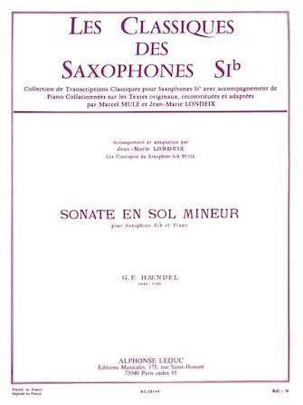 G.F.Handel's (1685-1759) Sonata in G minor is well-known to the Violin repertoire. Therefore, when French saxophonists, Marcel Mule (1901-2001) and Jean-Marie Londeix (b. 1932) arranged the popular piece for the Saxophone, it was very well-received. The Sonata in G minor is made up of four movements; Larghetto, Allegro, Adagio and Allegro. Handel's Sonata in G minor was first published in 1732 for Violin. Mule and Londeix's editions ensure that the Saxophone part contains the articulation, phrasing and breath marks necessary to the instrument. For all classical saxophonists, this arrangement of the popular Sonata in G minor is essential.