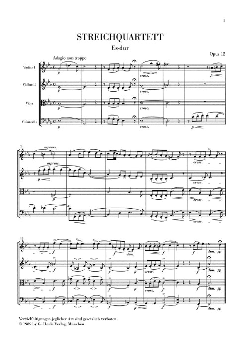 The string quartet is generally considered as the chamber-music genre of the classical era: invented by Haydn, elaborated by Haydn and Mozart, and brought to its compositional peak by Beethoven. All later quartet composers had to measure themselves against the works of these three masters. This applies first and foremost to Mendelssohn, who has always been called a classical romantic. His Quartet in A minor op. 13 in particular is said to have strong Beethovian stylistic traits. It was composed in late summer and fall 1827, shortly after Beethoven's late quartets appeared in print, works that Mendelssohn was no doubt familiar with. The Quartet in E flat Major op. 12 was written two years later, during Mendelssohn's first tour of England. A textually identical score of the two quartets is published in Henle's Study Scores series (HN 9270).