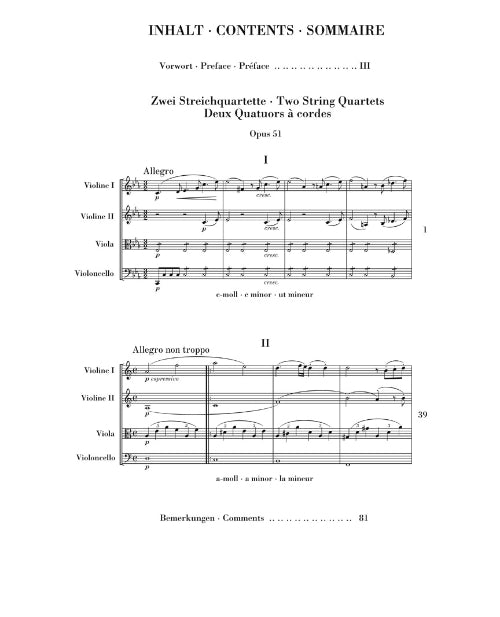 Brahms had already composed over 20 string quartets (he confessed to a friend that he had burnt all of that stuff) before he finally presented his Opus 51 to the public. In the end only three surviving works managed to withstand his high self-criticism; numerous layers of corrections bear witness to his struggle with each detail. We are now publishing the two passionate dark Quartets op. 51 separately from the rather more lively Opus 67. The basis for this edition is the volume in the New Complete Edition of Brahms' works, published in 2004 by Henle, for which previously missing sources in a Swiss bequest were consulted for the first time.