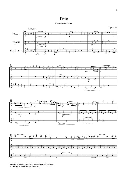 Both of these works for two oboes and cor anglais, which Beethoven composed in the 1790s, belong to the lighter genre of serenades and divertimentos. He might have written them in response to a commission or have been inspired by the prevailing popularity of this delicate combination of instruments. Likewise, with the Variations WoO 28 on the famous theme La cu darem la mano by Mozart, he made a contribution of his own to the arrangements of operatic melodies for wind ensembles that were so popular at the time. Our edition follows the recently published volume in the Beethoven Complete Edition and thus reflects the latest scholarly research on Beethoven.