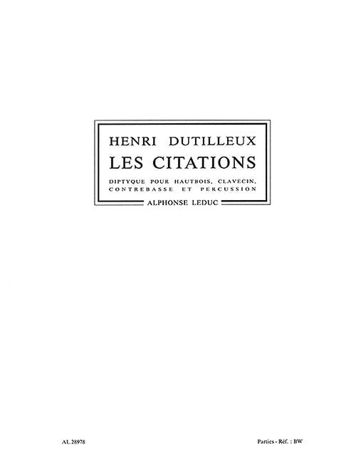 Composer: Henri Dutilleux Les Citations for Oboe, Harpsichord, Double Bass and Percussion Parts Publisher: Alphonse Leduc Category: Classical Series: Leduc Format: Paperback Henri Dutilleux: Les Citations, Diptyque (Quartet-Mixed) Inventory # : 48185422 UPC: 888680833527 ISBN: Width:...Regular price $89.99 -