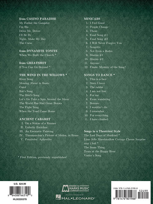 Composer: William Bolcom William Bolcom: Theatrical Songs Medium/Low Voice Softcover 51 songs, including music from Casino Paradise, Dynamite Tonite, Greatshot, The Wind in the Willows, Ancient Cabaret, Minicabs, Songs to Dance, and songs not from a...Regular price $29.99