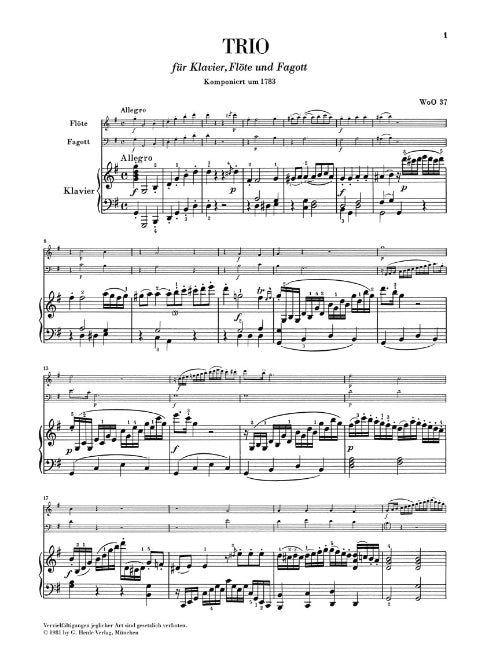 Composer: Ludwig van Beethoven Trio for Piano, Flute, and Bassoon, WoO 37 Publisher: Henle Urtext Edition Category: Band/Orchestra/Ensemble Series: Henle Music Folios Format: Softcover Flutists are always grateful for chamber music works that include their instrument...Regular price $34.99 -