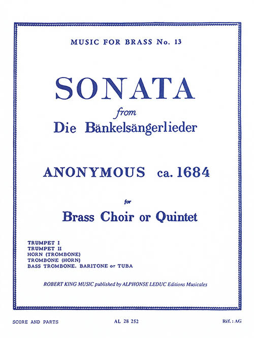 Composer: Anonymous Sonata from Die Bankelsangerlieder Brass Choir or Quintet Publisher: Robert King Category: Classical Series: Robert King Format: Paperback Sonata from Die Bänkelsängerlieder is a piece for Brass Quintet: two trumpets, a horn, a trombone...Regular price $23.99 -