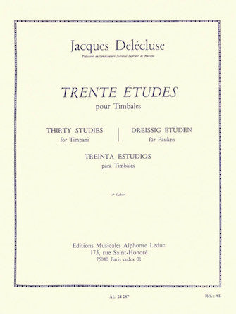 Composer: Jacques Delécluse 30 Studies For Timpani (volume 1) Publisher: Alphonse Leduc Category: Classical Series: Leduc Format: Softcover With few study books exisiting for the Timpani, Jacques Delécluse ensures that this gap is filled with his...Regular price $27.99 -