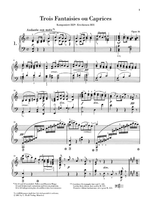 Felix Mendelssohn Bartholdy 3 Fantasies Ou Caprices Op 16 Piano Solo