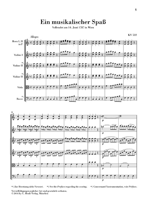Composer: Wolfgang Amadeus Mozart Ein Musikalischer Spass [A Musical Joke] K. 522 for 2 Violins, Viola, Basso and 2 Horns in F Study Score Publisher: Henle Urtext Edition Category: Band/Orchestra/Ensemble Series: Henle Study Scores Format: Softcover...Regular price $17.99 -