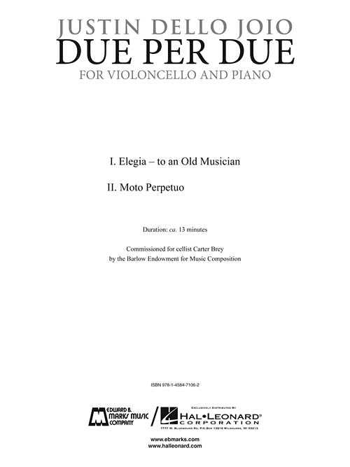 Composer: Justin Dello Joio Due Per Due Violoncello and Piano Softcover Score & Parts A virtuosic showpiece in two movements: I. Elegia - to an Old Musician and II. Moto Perpetuo. The first movement draws inspiration...Regular price $20.99 -