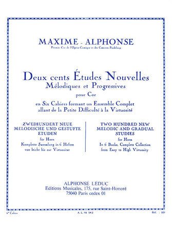 Composer: Maxime-Alphonse Deux Cents Etudes Nouvelles Melodiques et Progressives [Two Hundred New Melodic and Progressive Studies] for Horn Publisher: Alphonse Leduc Category: Classical Series: Leduc Format: Softcover In six books, Maxime Alphonse provides 200 progressive studies...Regular price $39.99 -