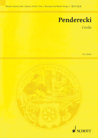 Composer: Krzysztof Penderecki Credo Publisher: Schott Category: Classical Series: Study Score Format: Softcover Soli (Soprano, Mezzo-Soprano, Alto, Tenor, Bass), Children's Choir, Mixed Choir and Orchestra. Inventory # : 49017913 UPC: 884088394370 ISBN: Width: 8.25" Length: 11.75"...Regular price $88.99 -