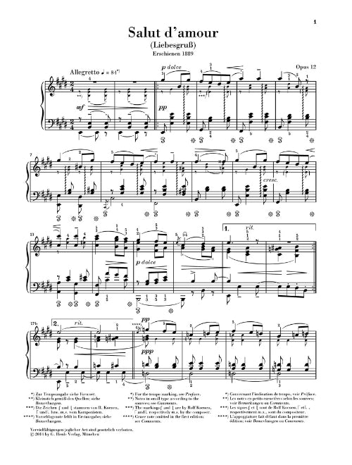 Composer: Edward Elgar Salut d'amour Op. 12 Piano Solo Publisher: G. Henle Verlag Category: Keyboard & Piano/Vocal/Guitar Series: Henle Music Folios Format: Softcover Edward Elgar's Salut d'amour is one of those pieces by the British composer...Regular price $14.99 -