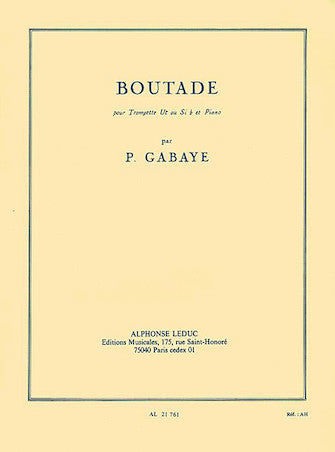 Composer: Pierre Gabaye Boutade, For Trumpet And Piano Publisher: Alphonse Leduc Category: Classical Series: Leduc Format: Softcover Successful French composer, Pierre Gabaye (1930-2000) studied at the Paris Conservatoire where he won the 1956 Prix de Rome....Regular price $25.99 -