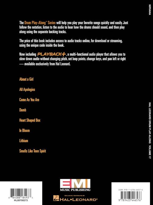Nirvana Drum Play-Along Volume 17 Publisher: Hal Leonard Category: Drums & Percussion Series: Drum Play-Along Format: Softcover Audio Online Play your favorite songs quickly and easily with the Drum Play-Along Series. Just follow the drum notation,...Regular price $23.99