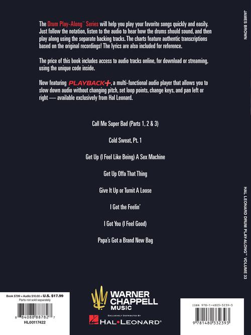 James Brown Drum Play-Along Volume 33 Publisher: Hal Leonard Category: Drums & Percussion Series: Drum Play-Along Format: Softcover Audio Online Play your favorite songs quickly and easily with the Drum Play-Along series! Just follow the drum...Regular price $27.99 -