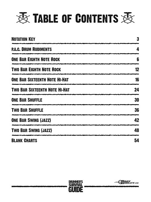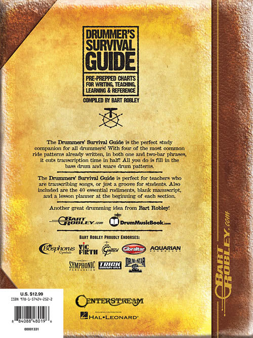 Author: Bart Robley Drummer's Survival Guide Pre-Prepped Charts for Writing, Teaching, Learning & Reference Softcover Presenting the perfect study companion for all drummers! With four of the most common ride patterns already written, in both one-...Regular price $15.99