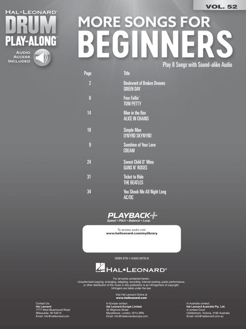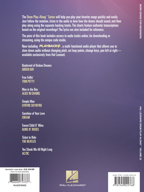 More Songs for Beginners Drum Play-Along Volume 52 Publisher: Hal Leonard Category: Drums & Percussion Series: Drum Play-Along Format: Softcover Audio Online Play your favorite songs quickly and easily with the Drum Play-Along Series. Just follow...Regular price $23.99 -