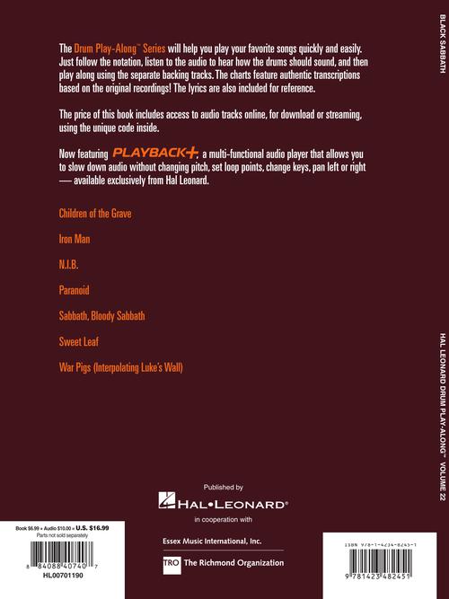 Black Sabbath Drum Play-Along Volume 22 Publisher: TRO Essex Music Group Category: Drums & Percussion Series: Drum Play-Along Format: Softcover Audio Online Play your favorite songs quickly and easily with the Drum Play-Along Series. Just follow...Regular price $27.99 -