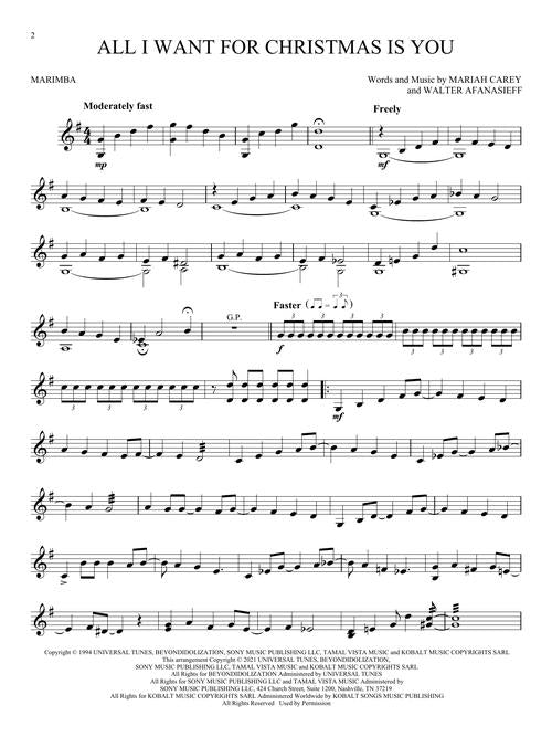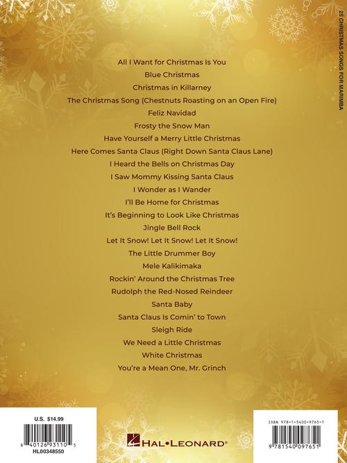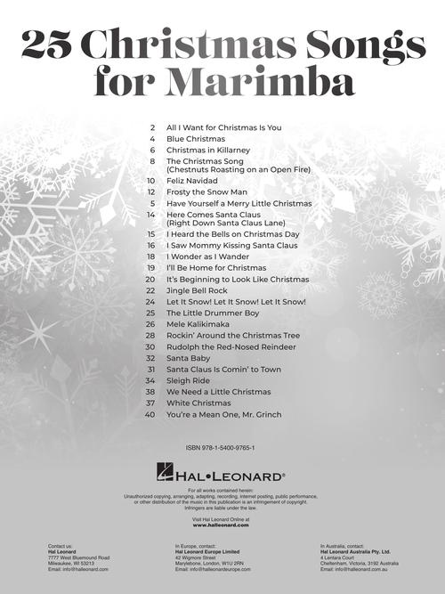 25 Christmas Songs for Marimba Publisher: Hal Leonard Category: Drums & Percussion Series: Percussion Format: Softcover A great collection of 25 holiday favorites arranged for marimba, including: All I Want for Christmas Is You · Feliz...Regular price $17.99 -