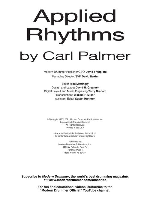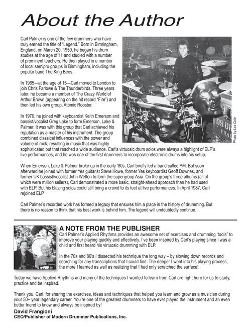 Applied Rhythms Publisher: Modern Drummer Publications Category: Drums & Percussion Series: Drum Book Format: Softcover Transcriptions of Carl's greatest performances with Emerson, Lake & Palmer, and Asia, plus Carl's personal exercises for development of drumset technique....Regular price $22.99 -