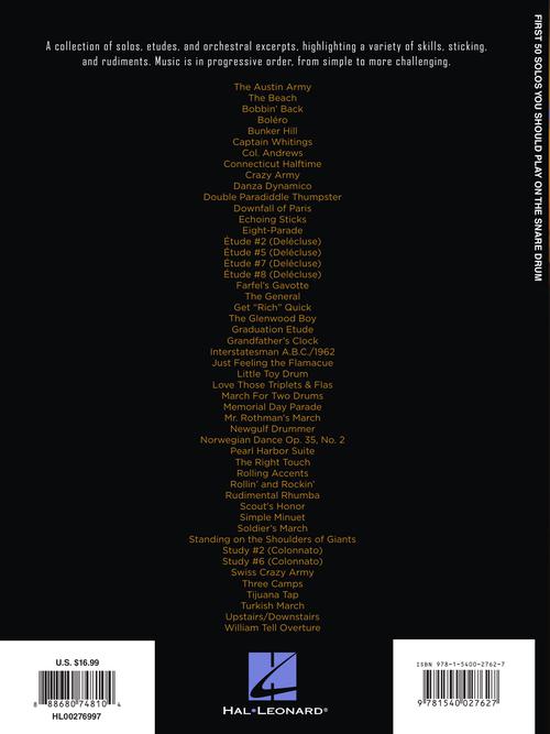 First 50 Solos You Should Play on Snare Drum Publisher: Hal Leonard Category: Drums & Percussion Series: Drum Book Format: Softcover The First 50 Solos You Should Play on Snare Drum includes 50 snare etudes, orchestra...Regular price $20.99 -