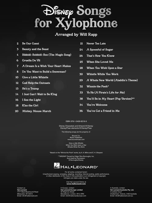 Composer: Various Disney Songs for Xylophone Publisher: Hal Leonard Category: Drums & Percussion Series: Percussion Format: Softcover 25 delightful Disney tunes in arrangements for xylophone. Includes: Be Our Guest (from Beauty and the Beast) · Cruella...Regular price $20.99 -