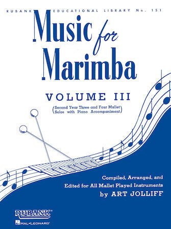 Composer: Art Jolliff Music for Marimba - Volume III Intermediate 3- and 4-Mallet Solos with Piano Accompaniment Publisher: Rubank Publications Category: Drums & Percussion Series: Rubank Solo Collection Format: Paperback Contents 3-mallet solos: Anniversary Theme (from...Regular price $8.99
