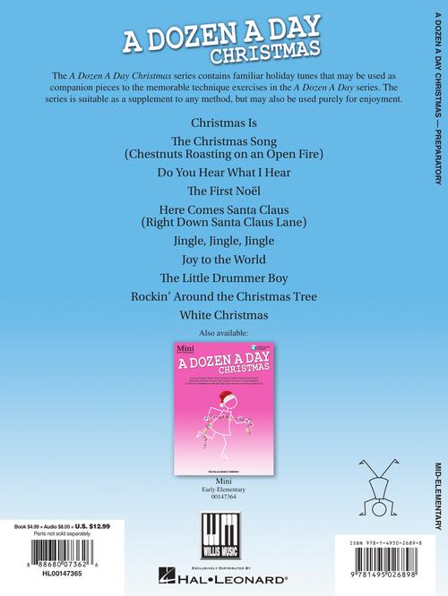 The A Dozen a Day Christmas series contains familiar holiday tunes that may be used as companion pieces to the memorable technique exercises in the A Dozen a Day series. The series is suitable as a supplement to any method but may also be used purely for enjoyment. Songs include: Christmas Is · The Christmas Song (Chestnuts Roasting on an Open Fire) · Do You Hear What I Hear · The First Noel · Here Comes Santa Claus (Right down Santa Claus Lane) · Jingle, Jingle, Jingle · Joy to the World · The Little Drummer Boy · Rockin' Around the Christmas Tree · White Christmas.