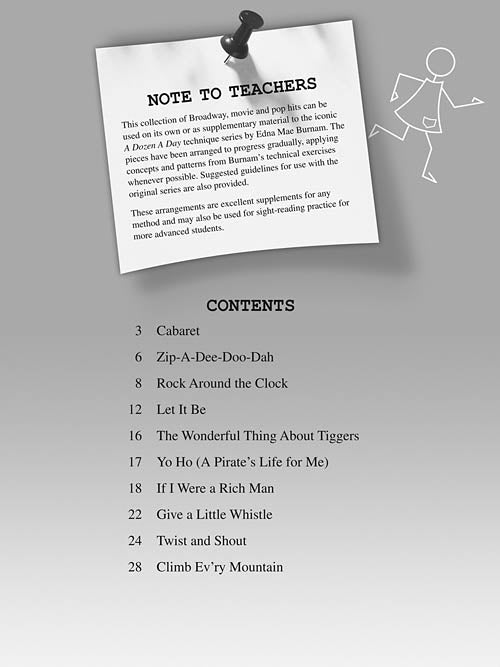 The A Dozen a Day Songbook series contains wonderful Broadway, movie and pop hits that may be used as companion pieces to the memorable technique exercises in the A Dozen a Day series. Also suitable as supplements with ANY method! Songs in Book 1 include: Cabaret · Climb Ev'ry Mountain · Give a Little Whistle · If I Were a Rich Man · Let It Be · Rock Around the Clock · Twist and Shout · The Wonderful Thing About Tiggers · Yo Ho (A Pirate's Life for Me) · Zip-A-Dee-Doo-Dah.