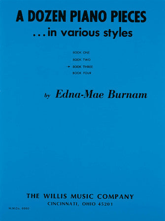 A Dozen Piano Pieces... in Various Styles is a series of four books that contain a stylish assortment of pieces. The books are leveled progressively, with Book 1 at a later elementary level, and Book 4 at a later intermediate level. In true Edna Mae Burnam form, all the pieces at each level have titles that are descriptive and vivid, e.g. Song of the Sewing Machine (Book 1), The Princess Learns the Minuet (Book 2), Busy Little Spanish Town (Book 3), and Five O'Clock Rush Hour (Book 4).