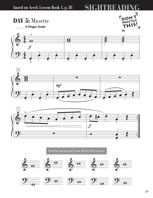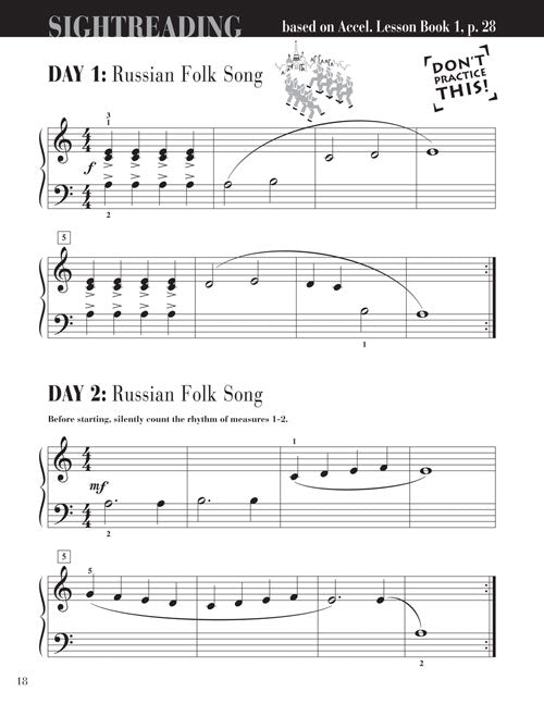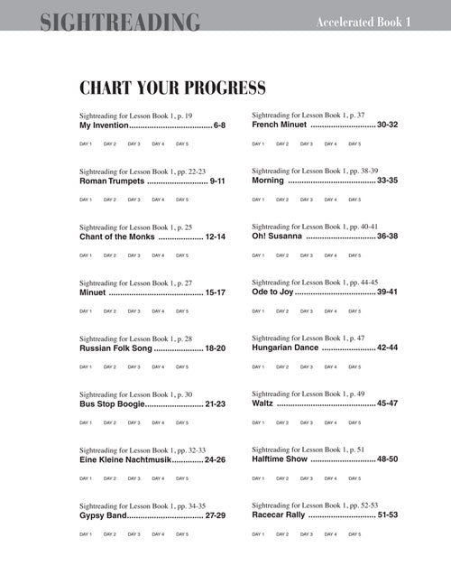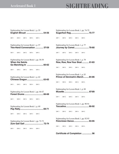 This highly effective sightreading course is developed specifically for the needs of the older beginner. There are five variations of each piece from the Accelerated Lesson Book 1, one for each day between lessons. Learning activities scattered throughout the book build pattern recognition skills. Concepts include: fundamental rhythms (including eighth notes), all the notes of the grand staff, intervals, and five-finger scale melodies in C and G.