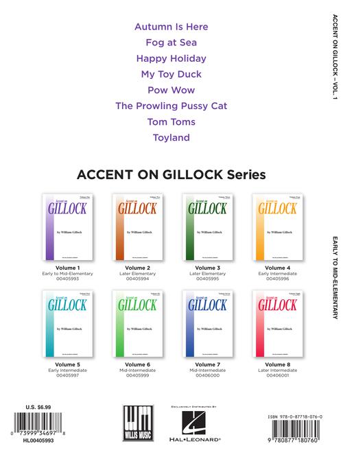 Accent on Gillock Volume 1 National Federation of Music Clubs 2020-2024 Selection Early to Mid-Elementary Level Publisher: Willis Music Category: Educational Keyboard Series: Willis Format: Softcover The Accent on Gillock series includes all of William Gillock's best-loved piano solos. Volume 1 includes early to mid-elementary pieces, all written in the remarkable Gillock style: · Fog at Sea · Prowling Pussy Cat · Autumn Is Here · Happy Holiday · My Toy Duck · Tom Toms · Pow Wow · Toyland. To see other NFMC selections, click here (http://www.halleonard.com/promo/promo.do?promotion=183) . Inventory # : 00405993 UPC: 73999346978 ISBN: 877180768 Width: 9" Length: 12" Height: 0.082" Product Weight: 0.2 lbs. Number of Pages: 16