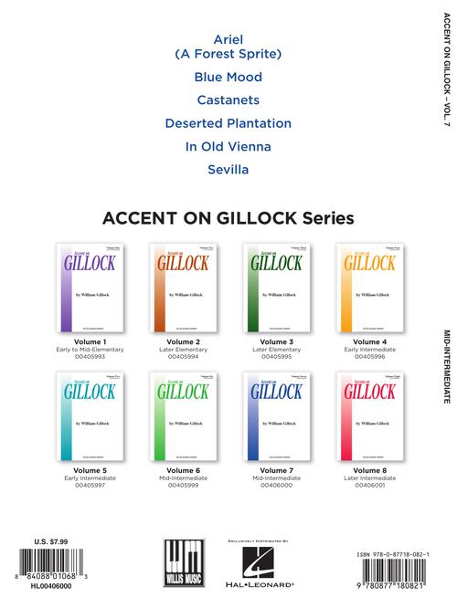 The Accent on Gillock series includes all of William Gillock's best-loved piano solos. Volume 7 includes more selected mid-intermediate favorites, all written in the remarkable Gillock style: · Ariel (A Forest Sprite) · Blue Mood · In Old Vienna · Sevilla · Dusk on the Bayou · Castanets.