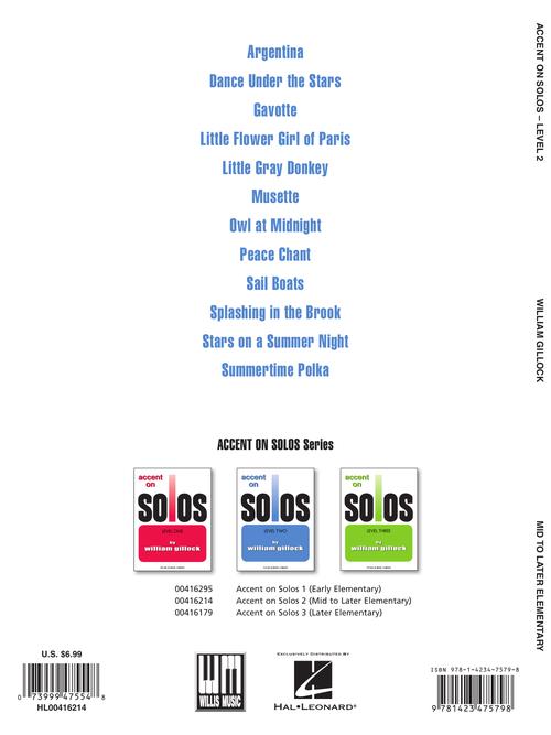 This popular 3-book series features original Gillock piano solos that progress from elementary to early intermediate level. The second book includes 12 fantastic pieces, including · Argentina · Dance Under the Stars · Gavotte · Little Flower Girl of Paris · Little Gray Donkey · Peace Chant · Sail Boats · Stars on a Summer Night.
