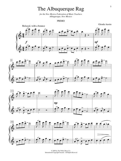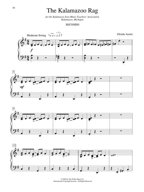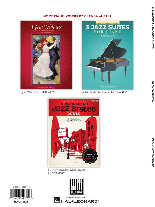 A collection of 6 ragtime duets inspired by various cities in the continental United States: Albuquerque, NM · Joplin, MO · Kalamazoo, MI · Kansas City, MO · Omaha, NE · Texarkana, TX. Exciting rhythms and hummable melodies make this a terrific collaborative collection!