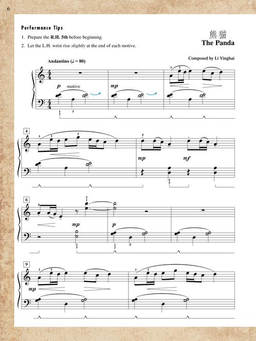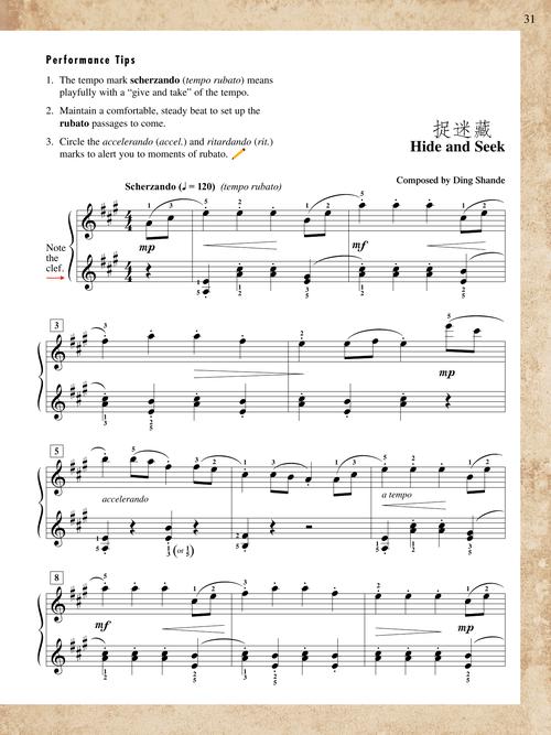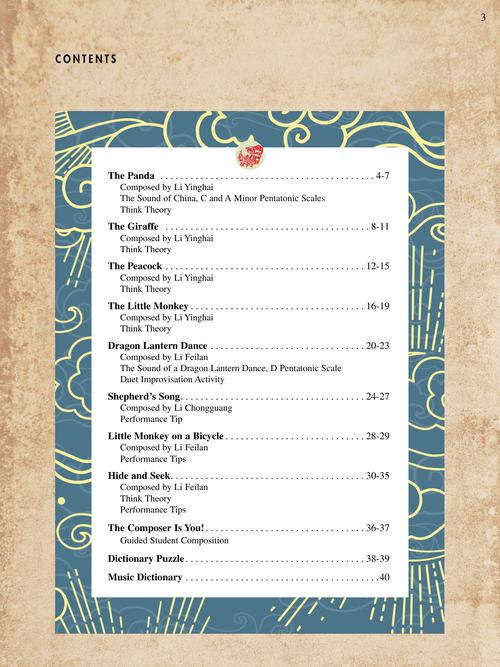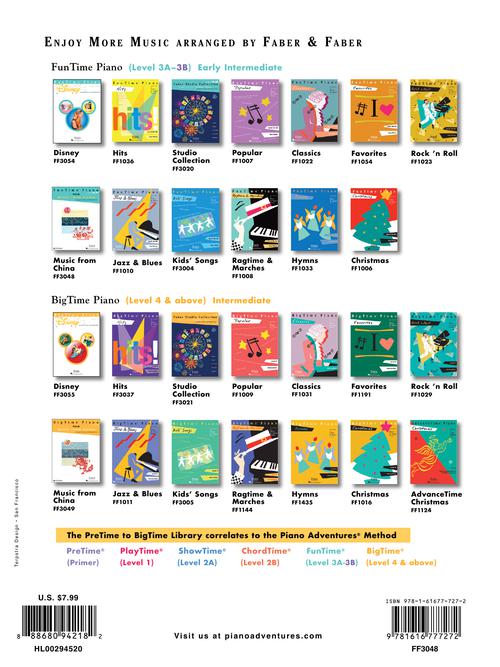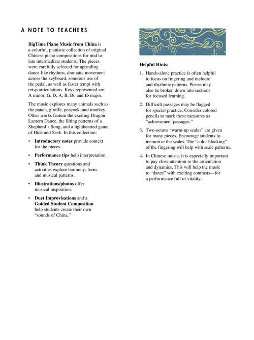 BigTime Piano Music from China is a striking selection of original Chinese compositions perfect for intermediate students (Level 4 and above). Thematically, the music explores a veritable zoo of animals from the real-life panda to the mythical dragon, in addition to traveling the rolling hills of a shepherd and playing a lighthearted game of hide and seek. Colorful introductory notes, vital performance tips, and analytical theory questions aid the student's musical journey, while duet improvisations and a composition exercise provide creative play. Songs include: Dragon Lantern Dance · The Giraffe · Hide and Seek · The Little Monkey · Little Monkey on a Bicycle · The Panda · The Peacock · Shepherd's Song.