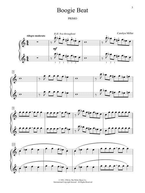 A fun, cool duet that helps young students identify blue notes AND keep a steady beat! Carolyn Miller added an accompanying Primo to this popular solo a few years after it was written, and it's now been newly engraved as a duet. Key: C Major.