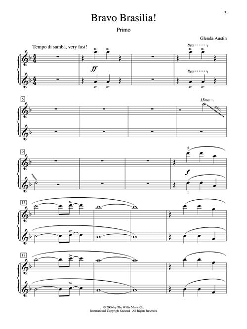A vivacious and rhythmic duet resplendent with the pulse of vibrant Brazil. This show-stopper keeps the beat going, yet provides an unexpected respite in the midsection for a brief but tender duet in 3:2, before building back up to a climactic ending. Excellent for recitals!