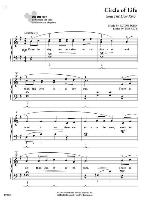 ChordTime Piano Disney showcases contemporary and classic Disney hits arranged for the Level 2B pianist. Students explore major scale and primary chord patterns in a setting of inspiring songs from timeless movies including Tangled, The Jungle Book, Moana, and more. Songs include: The Bare Necessities (The Jungle Book) · Be Our Guest (Beauty and the Beast) · Bella Notte (Lady and the Tramp) · Belle (Beauty and the Beast) · Circle of Life (The Lion King) · Fathoms Below (The Little Mermaid) · How Far I'll Go (Moana) · I Just Can't Wait to Be King (The Lion King) · I've Got a Dream (Tangled) · Supercalifragilisticexpialidocious (Mary Poppins).
