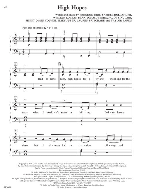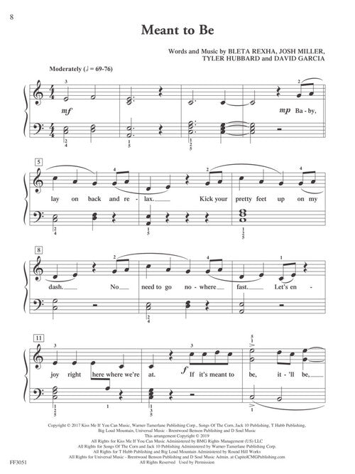 Enjoy 10 outstanding arrangements of popular hits by today's leading artists such as Ed Sheeran, Meghan Trainor, Imagine Dragons, and more. In keeping with the ChordTime concept, this collection motivates the Level 2B student to learn the building block harmonies of current pop music: the I, IV, V, and vi chords. Songs include: Brave (Sara Bareilles) · High Hopes (Panic! At the Disco) · Like I'm Gonna Lose You (Meghan Trainor feat. John Legend) · Meant to Be (Bebe Rexha feat. Florida Georgia Line) · The Middle (Zedd, Maren Morris & Grey) · Perfect (Ed Sheeran) · Rather Be (Clean Bandit feat. Jess Glynne) · This Is Me (from The Greatest Showman) · Thunder (Imagine Dragons) · Try Everything (Shakira, from Zootopia).