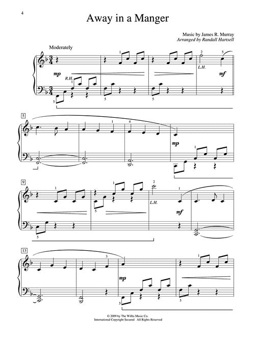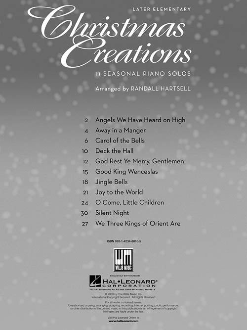 11 well-known Christmas carols arranged at a later elementary level. Hartsell occasionally introduces a little dissonance while keeping the spirit and warmth of each piece. Includes: Angels We Have Heard on High · Away in a Manger · Carol of the Bells · Deck the Hall · God Rest Ye Merry, Gentlemen · Good King Wenceslas · Jingle Bells · Joy to the World · O Come, Little Children · Silent Night · We Three Kings of Orient Are.