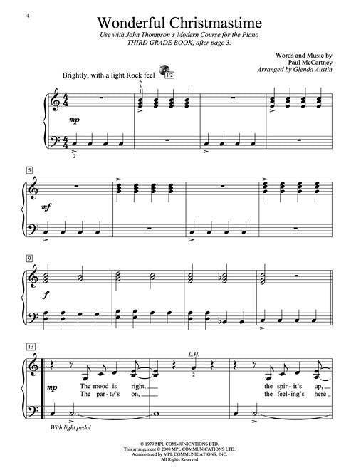 This collection features 10 titles carefully arranged to correspond with Grade 3 of the John Thompson's Modern Course for the Piano series. Includes: Carol of the Bells · I'll Be Home for Christmas · It's Beginning to Look Like Christmas · Jingle-Bell Rock · A Marshmallow World · Merry Christmas, Darling · The Most Wonderful Day of the Year · Pat-A-Pan (Willie, Take Your Little Drum) · Wonderful Christmastime · You're All I Want for Christmas.