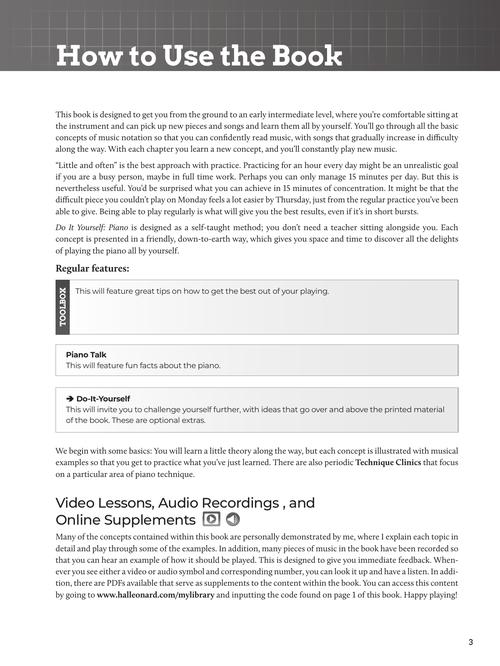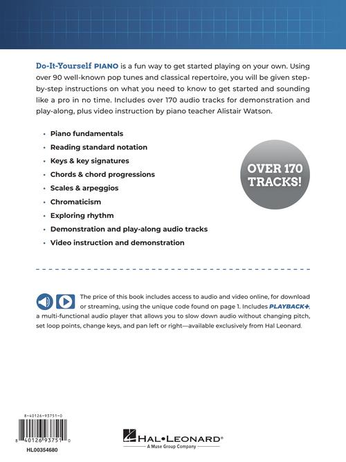 Do-It-Yourself Piano is a fun way to get started playing on your own. Using over 90 well-known pop tunes and classical repertoire, you will be given step-by-step instructions on what you need to know to get started and sounding like a pro in no time. Includes over 170 audio tracks for demonstration and play-along, plus video instruction by piano teacher Alistair Watson. Covers: · Piano fundamentals · Reading standard notation · Keys & key signatures · Chords & chord progressions · Scales & arpeggios · Chromaticism · Exploring rhythm · Demonstration and play-along audio tracks · Video instruction and demonstration The price of this book includes access to audio and video online, for download or streaming, using the unique code found inside. Includes PLAYBACK+, a multi-functional audio player that allows you to slow down audio without changing pitch, set loop points, change keys, and pan left or right.