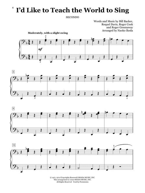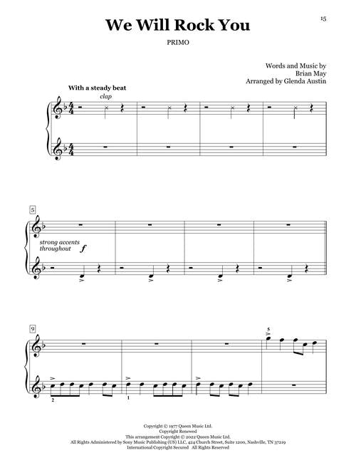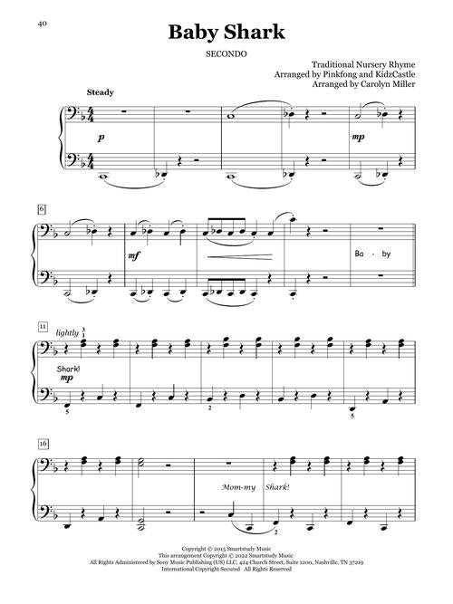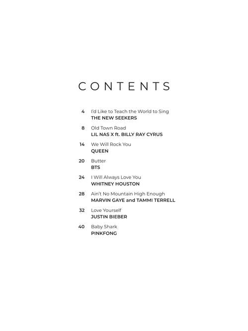 Eight great pop tunes arranged for one piano, four hands! Enjoy music-making with your best friend and sing out loud or repeat the parts you like as often as you want! Titles: Ain't No Mountain High Enough · Baby Shark · Butter (BTS) · I Will Always Love You · I'd Like to Teach the World to Sing · Love Yourself (Justin Bieber) · Old Town Road (Lil Nas X) · We Will Rock You (Queen).